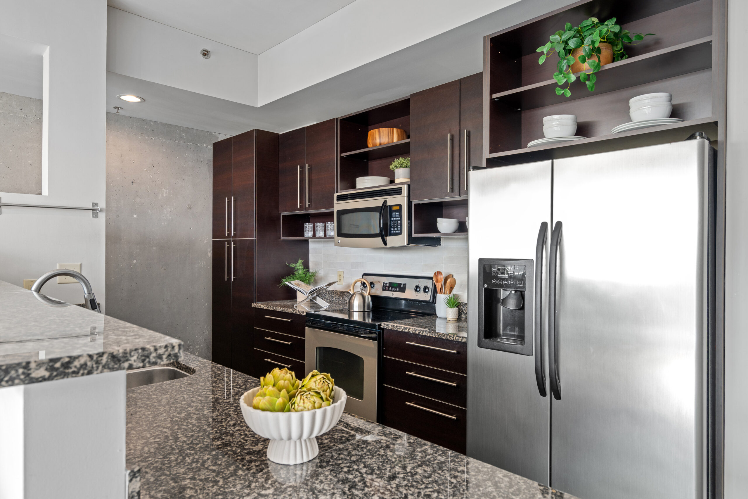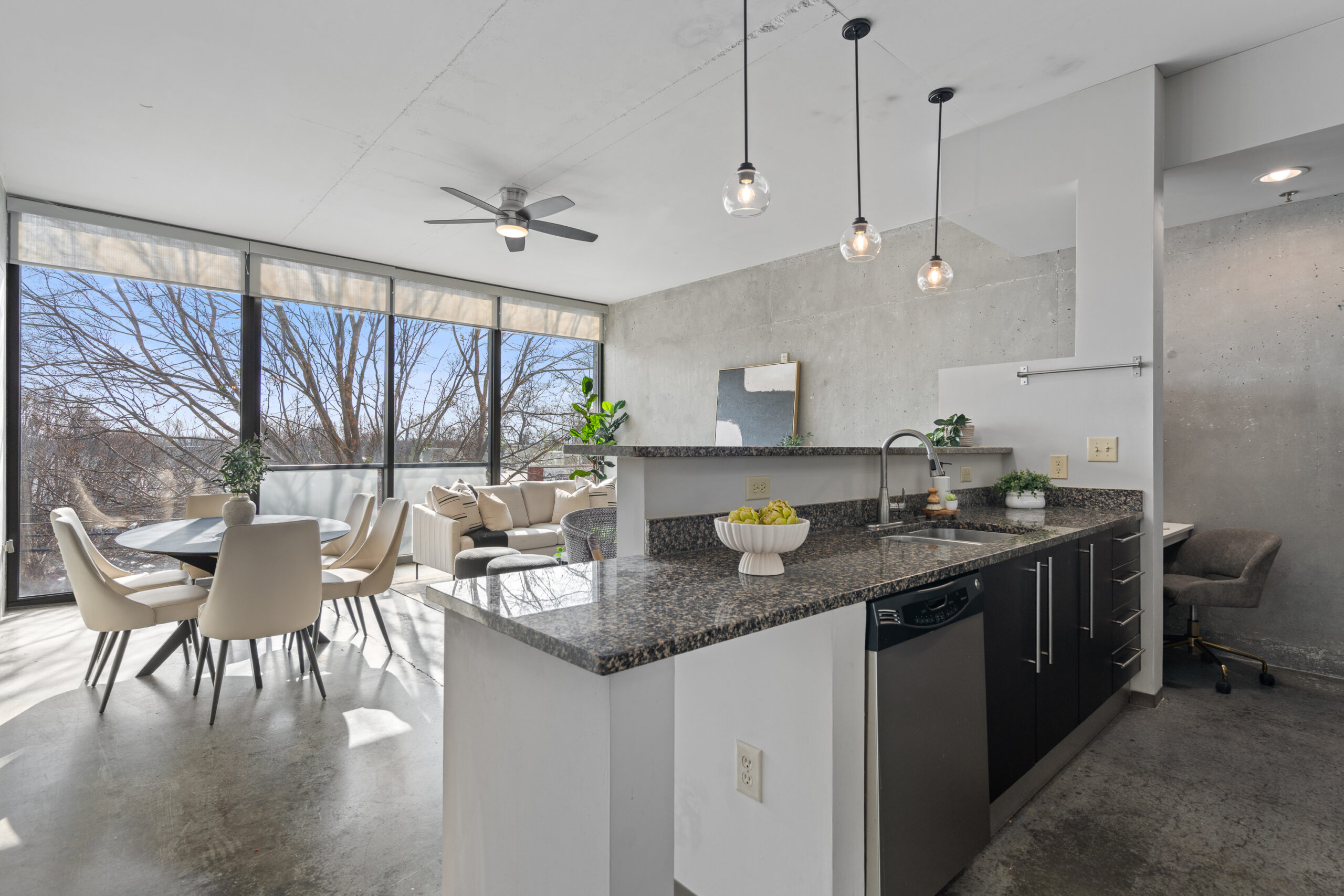 The soaring 10-foot ceilings and original concrete walls and polished concrete floors give the space that authentic industrial loft aesthetic that’s so sought-after in Atlanta. But this isn’t a raw, unfinished space. The current owners have invested in a series of thoughtful updates that give Unit 324 a warm, move-in-ready feel: new pendant lighting sets the mood throughout, freshly painted walls brighten the space, and a stylish new kitchen backsplash ties the cooking area together beautifully.